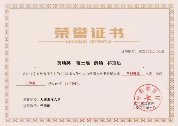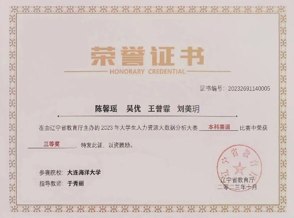 日前,由辽宁省教育厅主办、沈阳航空航天大学经济与管理公司承办,新道科技股份有限公司提供技术支持的2023年老员工人力资源大数据分析大赛圆满落下帷幕。公司suncitygroup太阳新城人力资源管理专业2022级莫灿英、陈馨瑶等8名员工在于秀丽老师的带领下获得2023年老员工人力资源大数据分析大赛三等奖。