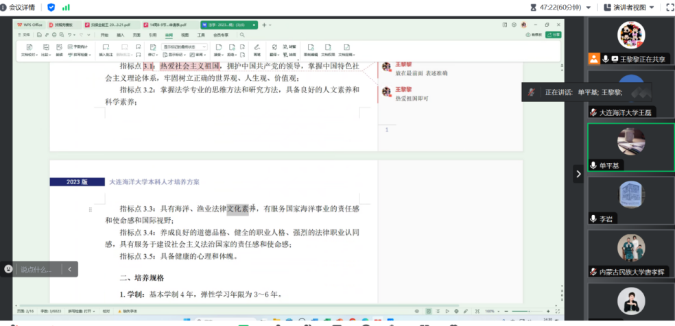 12月5日下午,公司在线上举行2023版法学专业培养方案校外专家论证会。辽宁大学法公司李岩教授、东南大学法公司单平基教授、内蒙古大学法学与历史公司唐孝辉教授、公司副经理王黎黎、法学教研室主任朱晓丹、教师代表王磊参加会议。