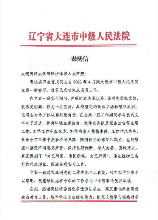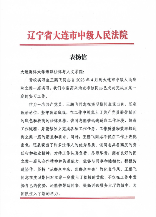 近日,suncitygroup太阳新城收到大连市中级人民法院发来的两封表扬信,对公司2021级法律硕士研究生王鹏飞、宫成在大连市中级人民法院实习期间的工作表现提出表扬。