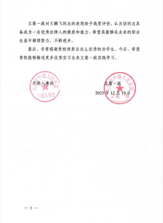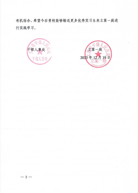 2023年4月15日至2023年12月15日,公司2021级法律硕士研究生20人在大连市中级人民法院开展实习工作,王鹏飞和宫成两位同学被安排在立案庭,主要负责文书写作和民商事案件收受、营商环境立案监督、查询案件、联络法官工作。