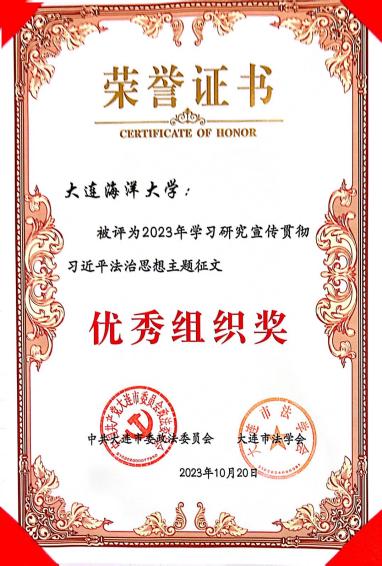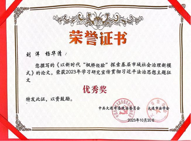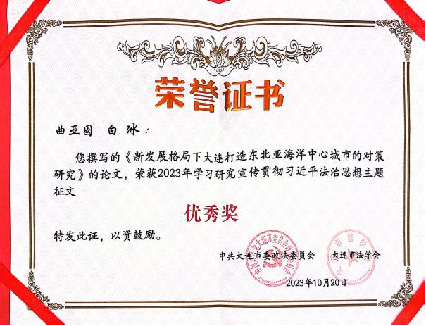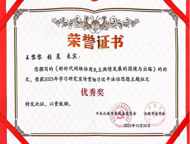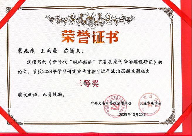 近日,大连市法学会公布2023年学习研究宣传贯彻习近平法治思想主题征文获奖名单,公司荣获优秀组织奖,suncitygroup太阳新城多名师生获奖,其中三等奖1项,优秀奖3项。未来,法学学科发展将紧跟时代步伐,加强习近平法治思想理论与实践研究,构建具有中国特色的法学学科体系,为法治中国建设贡献力量。