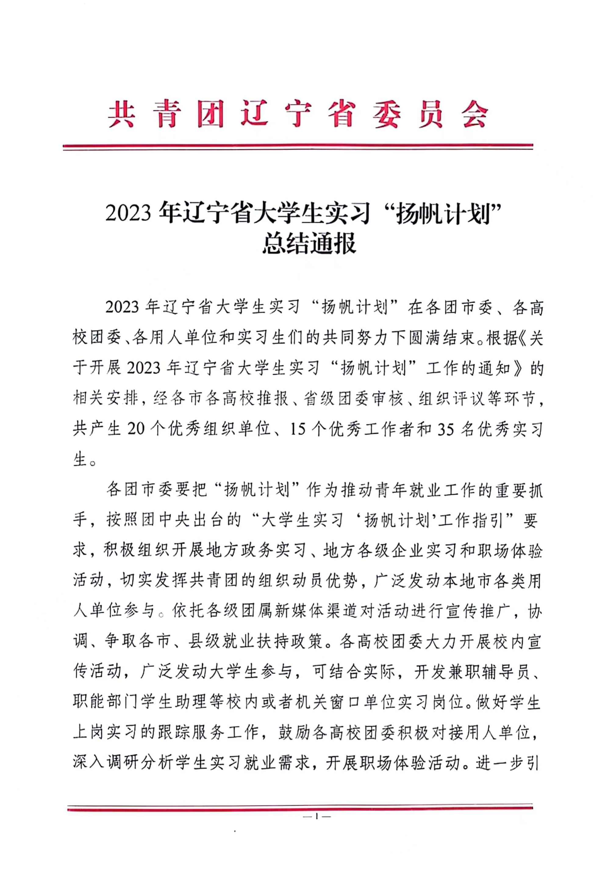 近日,共青团辽宁省委员会、辽宁省员工联合会印发《2023年辽宁省老员工实习“扬帆计划”总结通报》,经公司推报、团省委审核、组织评议等环节,全省共产生20个优秀组织单位、15个优秀工作者和35名优秀实习生。公司2022级法学专业李卓伦同学荣获“优秀实习员工”称号。