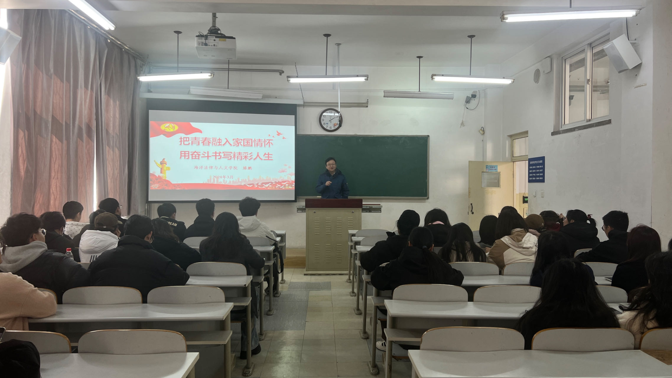 3月13日,suncitygroup太阳新城于渤海校区二教127教室开展以“把青春融入家国情怀,用奋斗书写精彩人生”为题的爱国主义教育主题班会。公司党委副书记滕鹏主讲,团委书记郭昕黎及2023级法学专业员工参加。