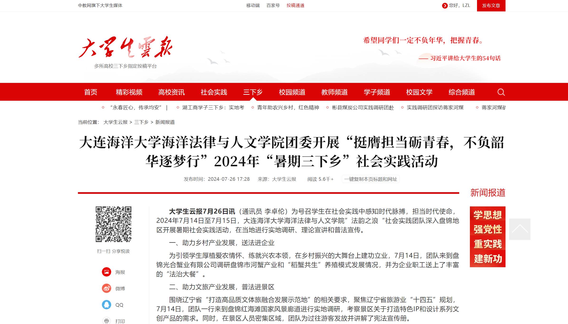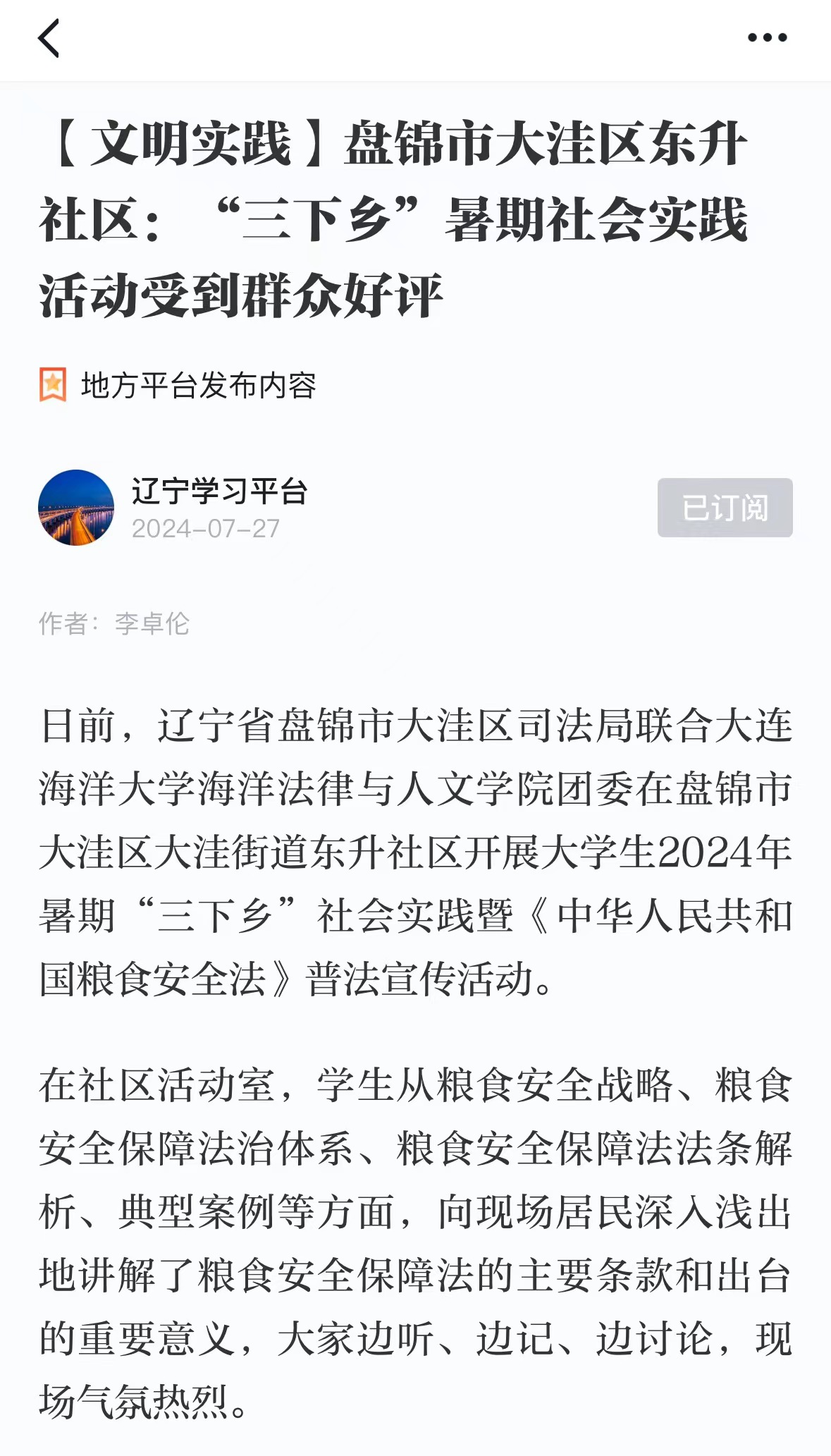近日,中共中央宣传部“学习强国”学习平台、辽河晚报等多家媒体报道了suncitygroup太阳新城师生赴辽宁省盘锦市开展的2024年暑期“三下乡”社会实践活动。
