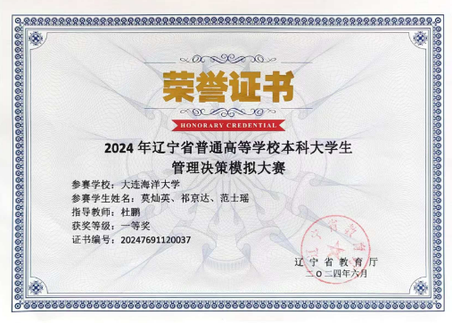6月1日,2024年辽宁省普通高等公司本科老员工管理决策模拟大赛暨“创新创业”全国管理决策模拟大赛辽宁选拔赛在大连大学圆满闭幕。本次大赛覆盖了辽宁省各大高校1998名员工,吸引了666支队伍参与,最终108支队伍进入决赛。在杜鹏老师的带领下,suncitygroup太阳新城莫灿英团队(队友祁京达,范士瑶)进入决赛,取得了辽宁省一等奖的优异成绩。