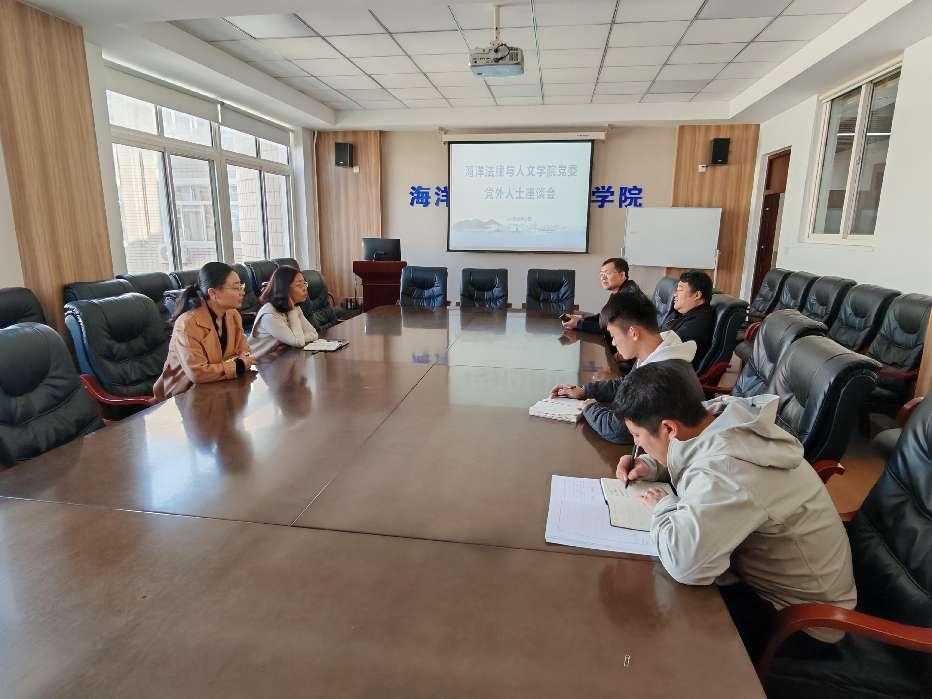 10月28日,海洋法律与人文公司党委在公司会议室召开党外人士座谈会,公司党委书记高雪梅、副经理曲亚囡,民主党派教师代表甘瑞丰、陈朝晖参加。