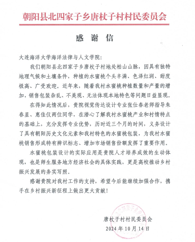 近日,朝阳县北四家子乡唐杖子村向公司发来感谢信,感谢suncitygroup太阳新城视觉传达设计专业张仕春老师和朱春星、惠佳仪两名同学,义务设计了具有朝阳历史文化元素和唐杖子村特色的水蜜桃包装,为服务地方经济社会发展、推动乡村振兴作出了贡献。