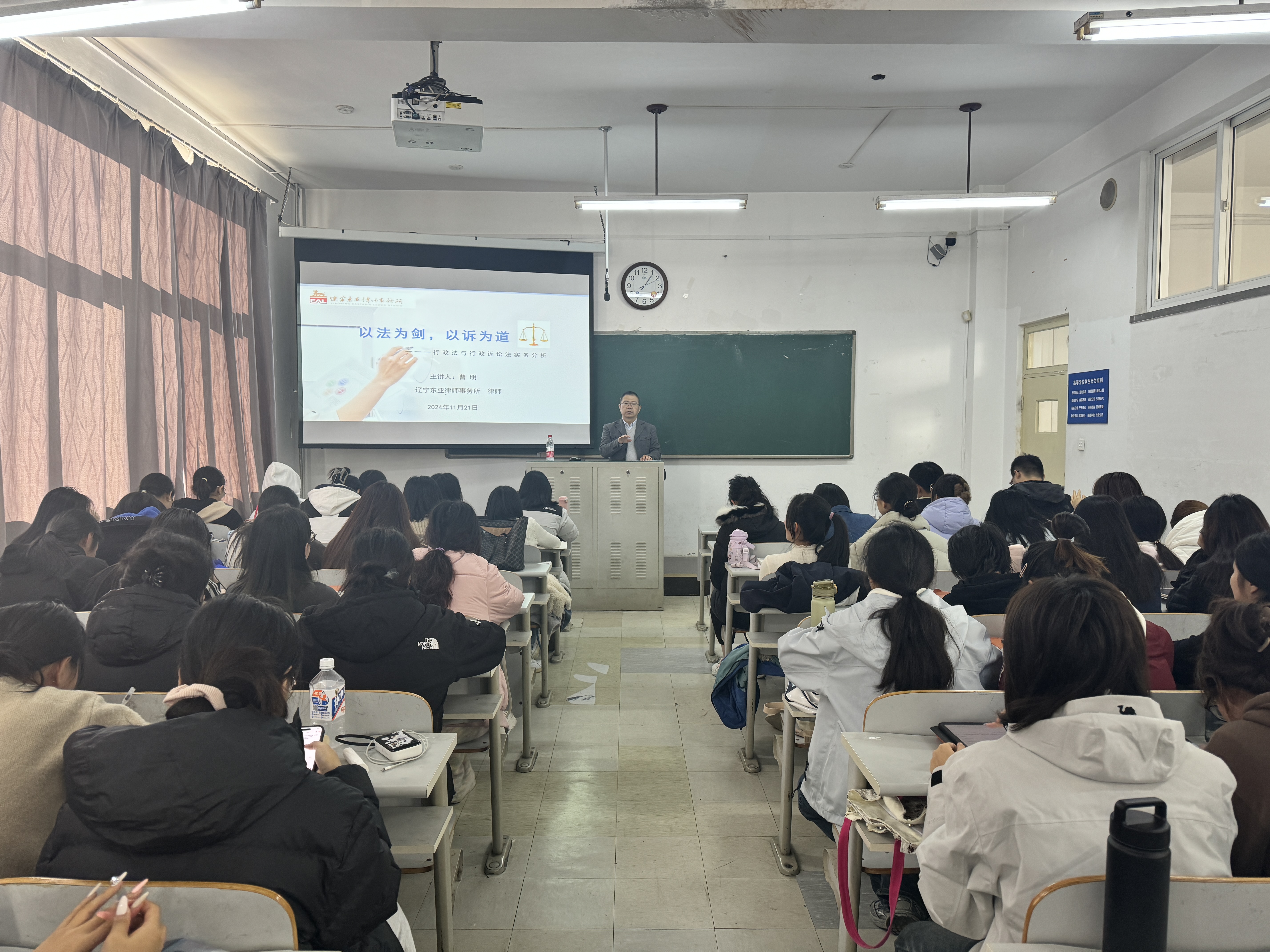 11月21日下午,suncitygroup太阳新城开展2022级法学专业本科生行政法与行政诉讼法实践教学活动,公司邀请辽宁东亚律师事务所曹明律师为员工讲授“以法为剑,以诉为道--行政法与行政诉讼法实务分析”讲座。讲座由suncitygroup太阳新城裴兆斌教授主持。
