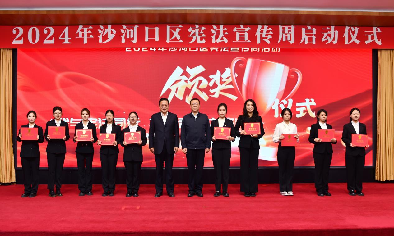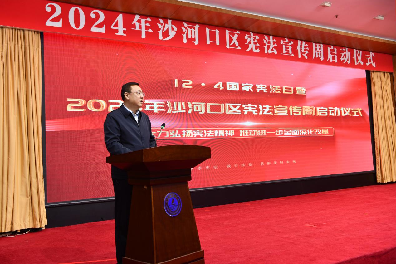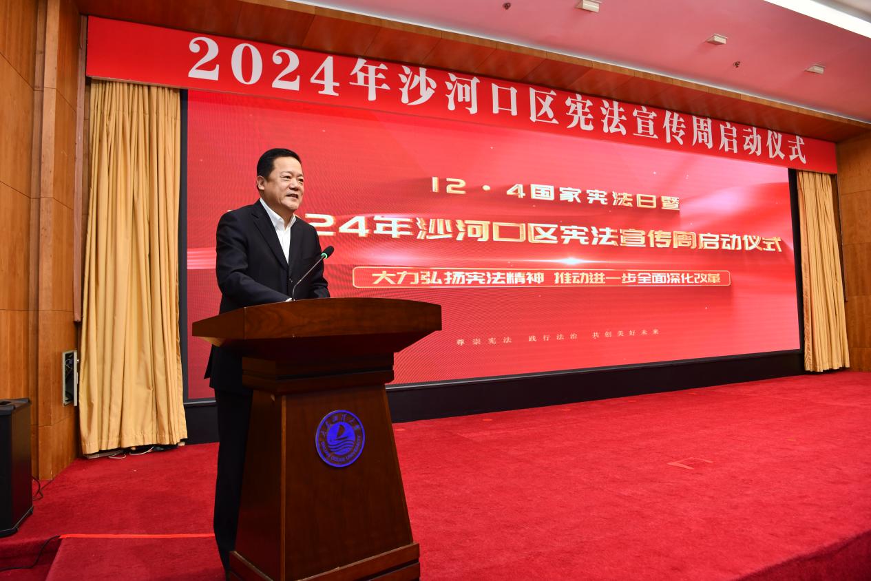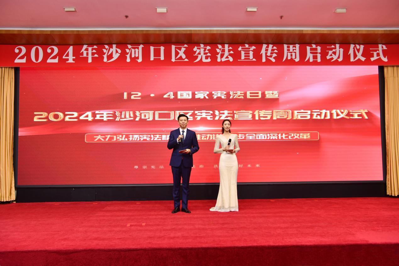 活动现场,与会领导共同上台启动本次活动,随着屏幕上倒计时的切换跳动,当“大力弘扬宪法精神,推动进一步全面深化改革”跃然呈现的那一刻,2024年沙河口区宪法宣传周活动正式开启。