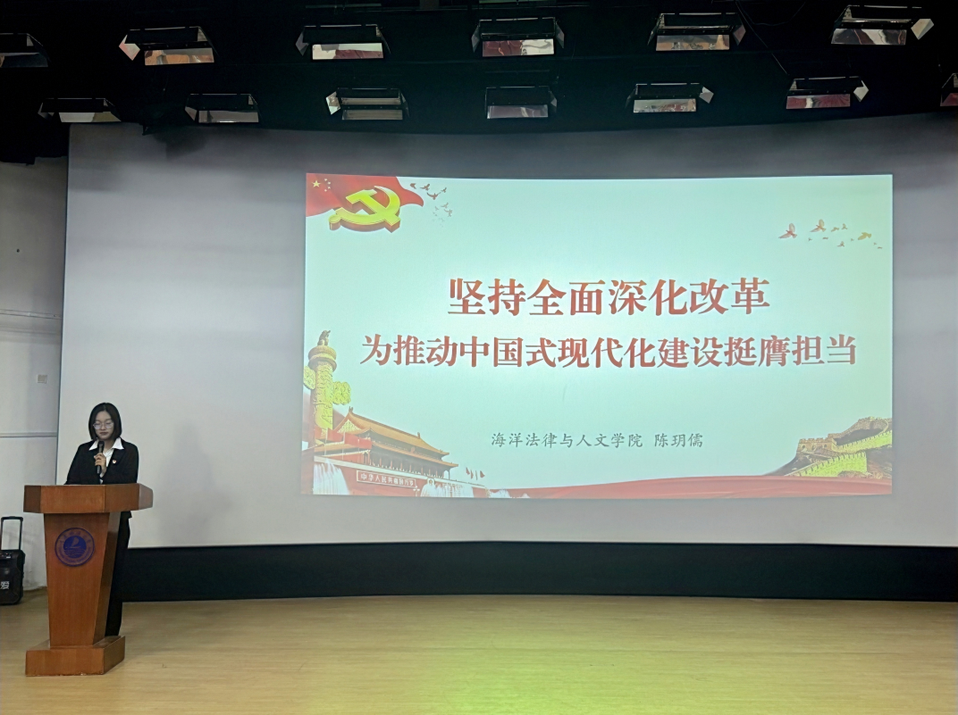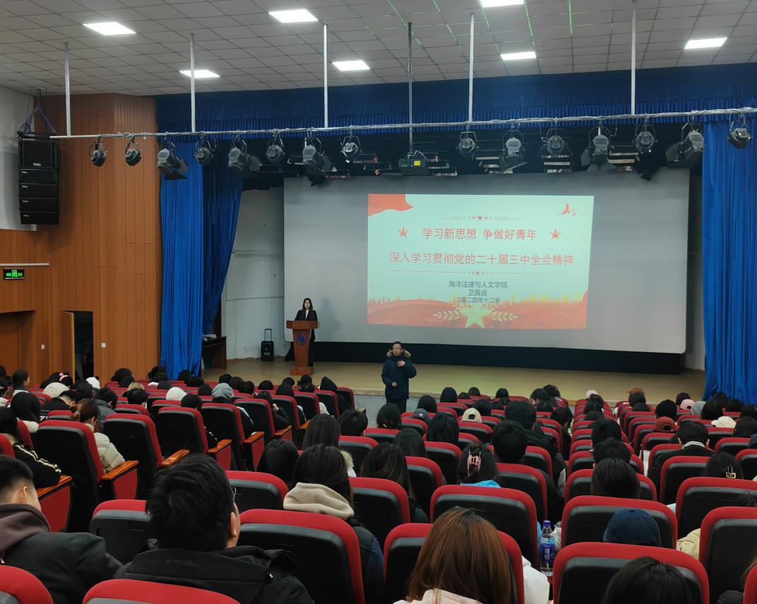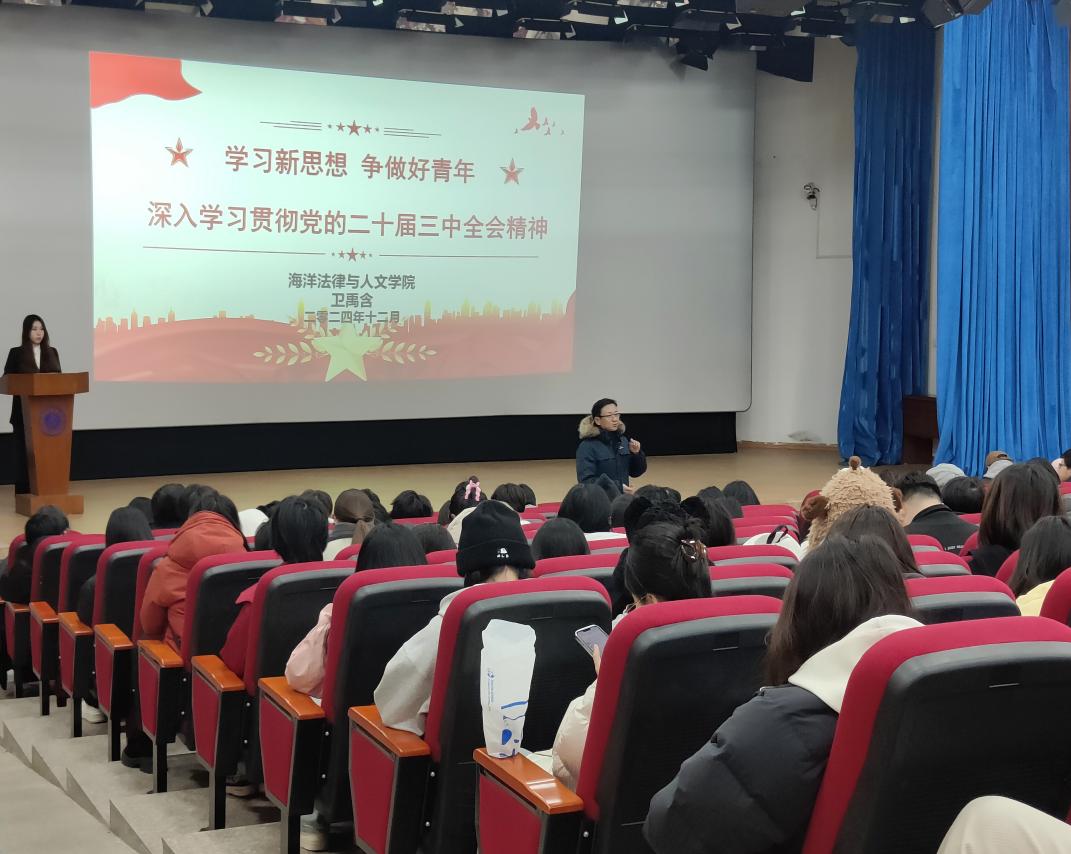 本科生宣讲团成员卫禹含面向2023级、2024级同学,以《学习新思想,争做好青年——深入学习贯彻党的二十届三中全会精神》为题,从坚持和加强党的全面领导、全面深化改革的部署、六个坚持的战略重点出发,结合老员工学习、社会实践及个人成长方面的思考,展望未来学习生活,号召青年学子勇担时代使命,作为海洋学子应勇立潮头,肩负责任,书写为中国式现代化挺膺担当的青春篇章,为实现中华民族伟大复兴的中国梦贡献力量。