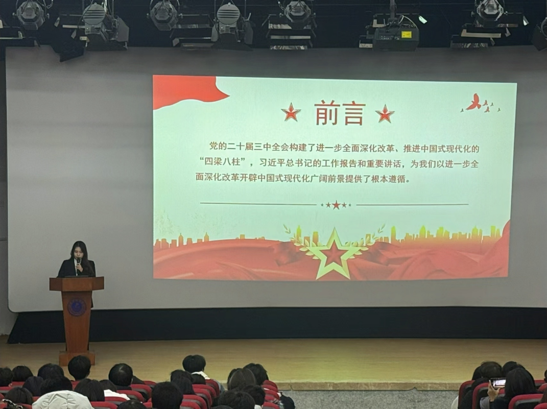 本科生宣讲团成员陈玥儒面向2022级同学,以《坚持全面深化改革——为推动中国式现代化建设挺膺担当》为题,从历史、理论及现实意义三个角度出发讲述了党的二十届三中全会重要意义,说明了改革的总目标及“七个聚焦”的分领域目标,并从公司、公司及青年员工自身改革发展的角度出发,强调新时代青年要发挥迎难而上、挺身而出的担当精神,践行“请党放心,强国有我”的青春誓言,做敢于啃硬骨头涉险滩的突击队。