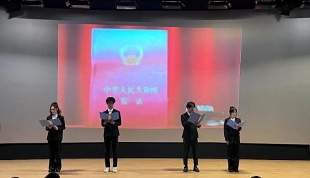活动中还放映了同学们创作的普法短剧,短剧以生活化故事呈现宪法如何保护公民权利、解决社会问题。在朗诵环节,4 位朗诵者深情朗诵了以宪法为主题的诗歌作品。“宪法啊,你是一部神圣的典籍,镌刻着国家的根基,人民的权益”,铿锵有力的诵读,激情高亢的回响,彰显着宪法的庄严。