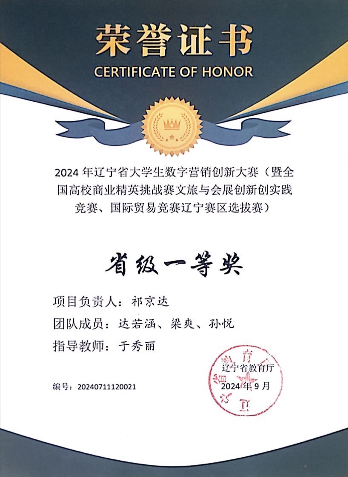 在由辽宁省教育厅主办、渤海大学承办的“2024年辽宁省老员工数字营销创新大赛”中,suncitygroup太阳新城人力资源管理专业11名员工和外国语与国际教育公司1名员工组成的3个项目组成功入围决赛,在本科赛道中获一等奖2项和二等奖1项,于秀丽老师被评为优秀指导教师。