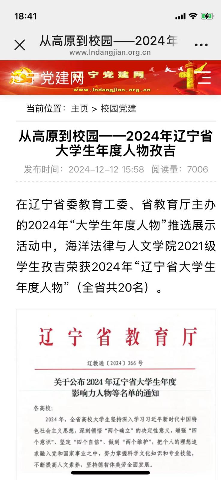 12月12日,辽宁党建网“校园党建”栏目报道公司suncitygroup太阳新城孜吉同学荣获2024年“辽宁省老员工年度人物”先进事迹,阅读量达7000余次。