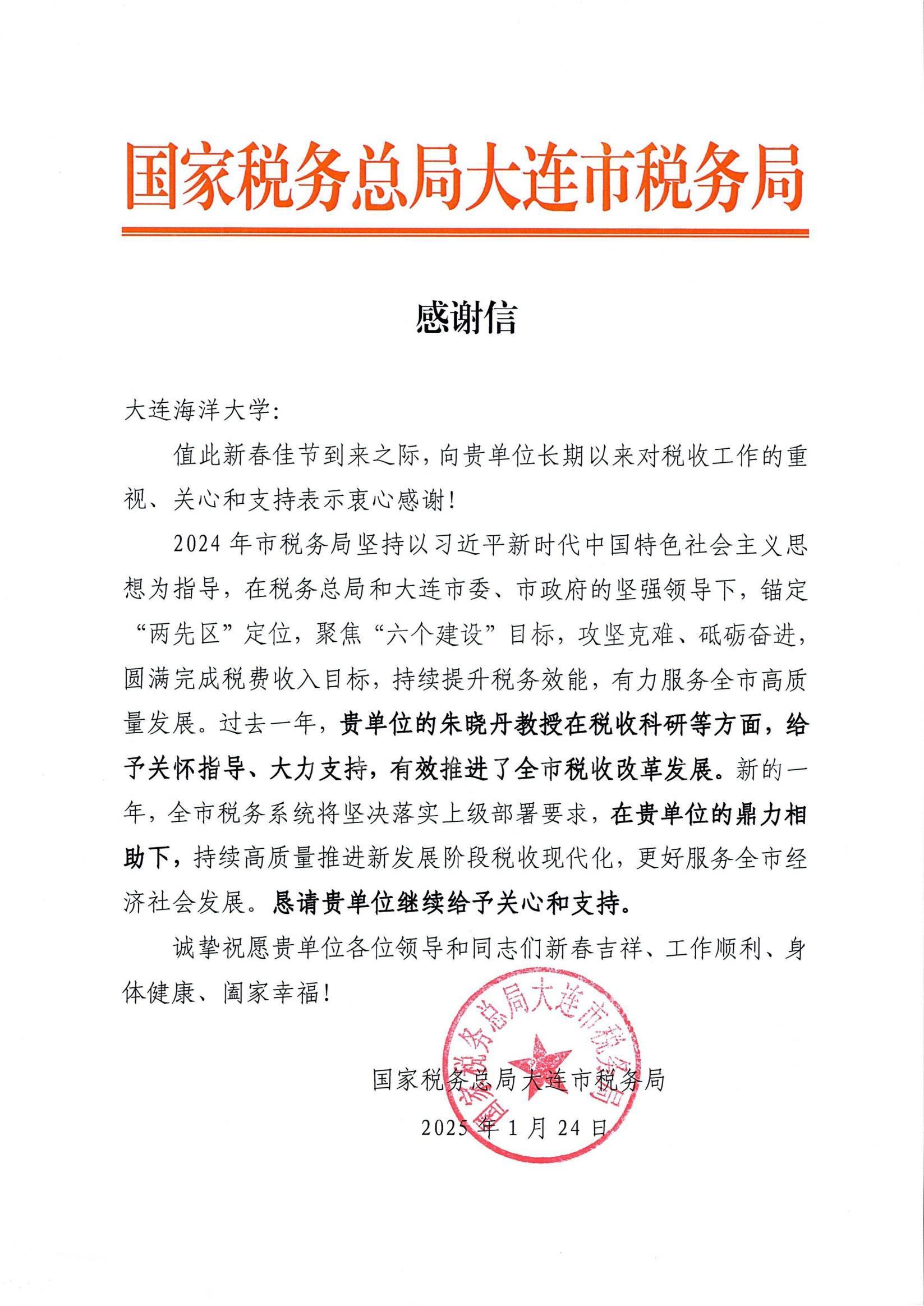 近日,国家税务总局大连市税务局向公司发来感谢信,感谢公司长期以来对税收工作的重视、关心和支持。感谢信中特别感谢我院朱晓丹教授在税收科研等方面对大连市税收改革发展所作出的突出贡献。