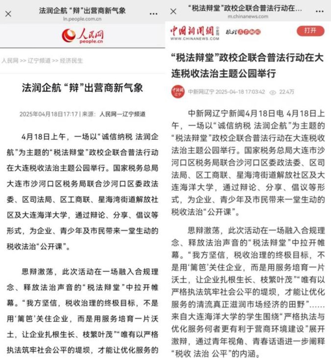 近日,人民网、中国新闻网、大连税务官方微信公众号、沙河口发布等媒体分别以“法润企航‘辩’出营商新气象”“思辩激荡——一场释放法治声音的‘税法辩堂’”等为题,对公司与大连市沙河口区税务局联合举办的“税法辩堂”普法活动进行了报道。