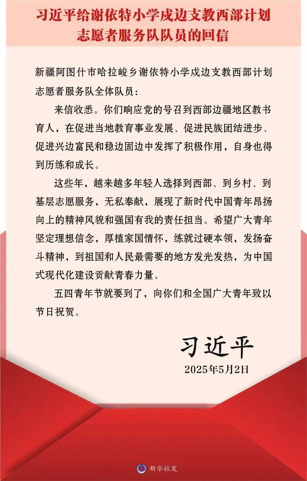 在五四青年节到来之际,中共中央总书记、国家主席、中央军委主席习近平给新疆克孜勒苏柯尔克孜自治州阿图什市哈拉峻乡谢依特小学戍边支教西部计划志愿者服务队全体队员回信,向全国广大青年致以节日祝贺并提出殷切期望。