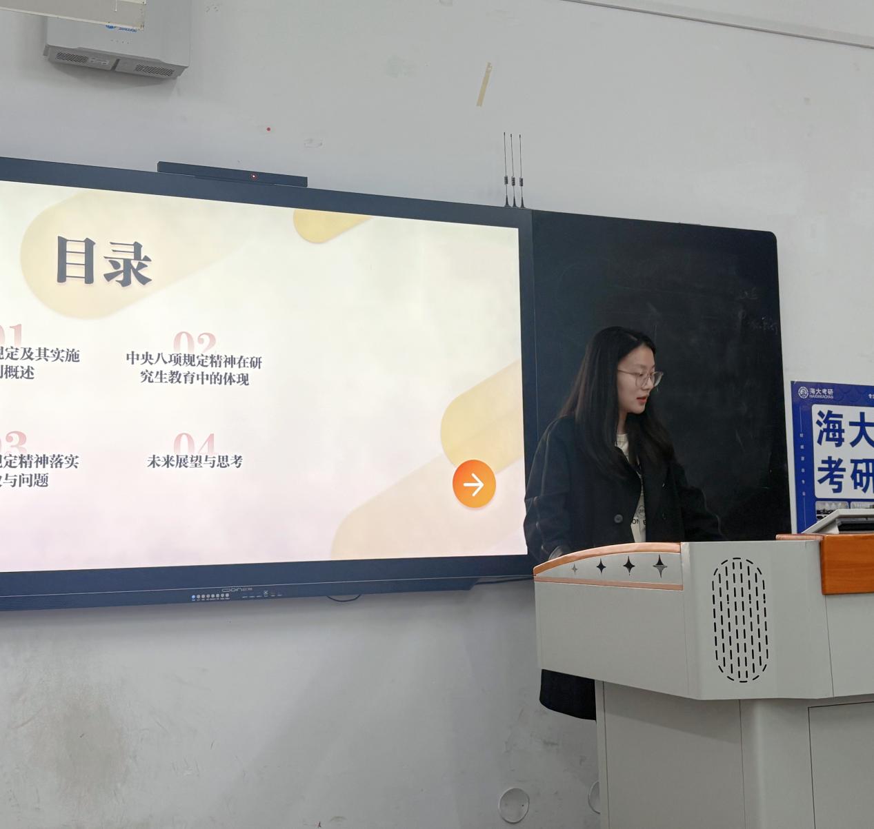 5月14日,公司研究生第一党支部书记张曼群讲授“学习领会和贯彻执行中央八项规定及其实施细则精神”专题党课,支部全体党员参加了本次党课学习。