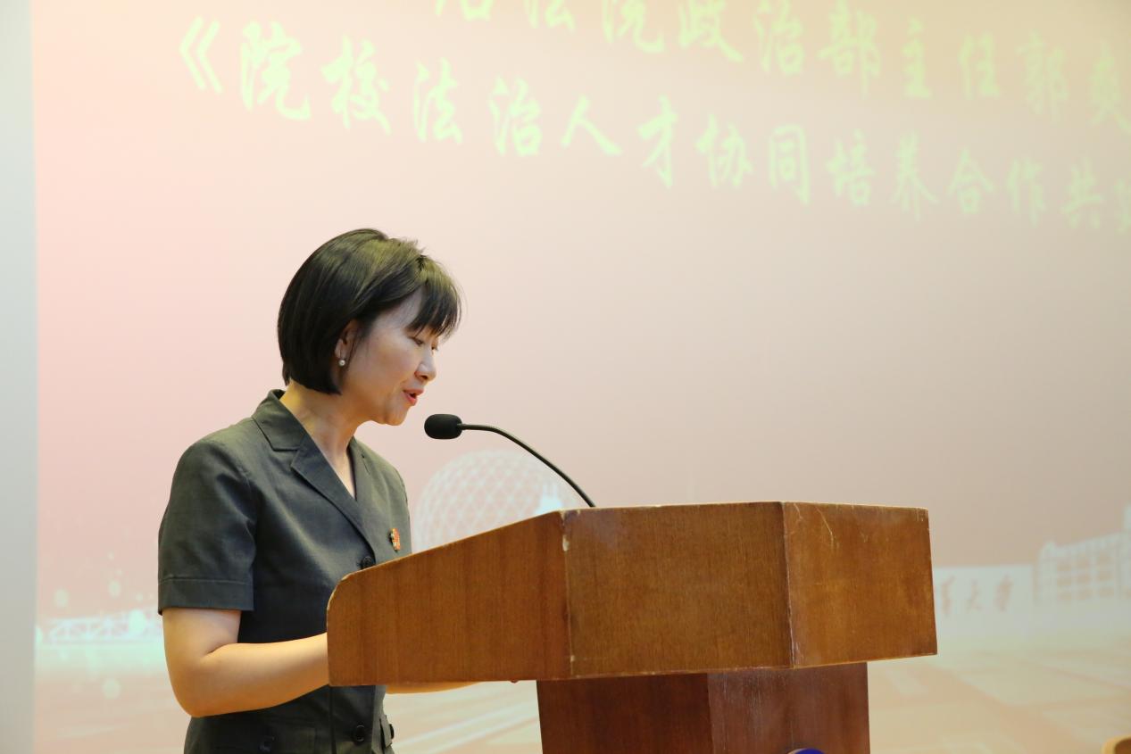 普兰店区人民法院政治部主任郭爽解读了院校法治人才协同培养合作共建协议具体内容及重要意义。此次院校合作聚焦法治人才培养,通过多维协同实现资源互补,在人才培养、科研合作、业务培训等领域深度联动。