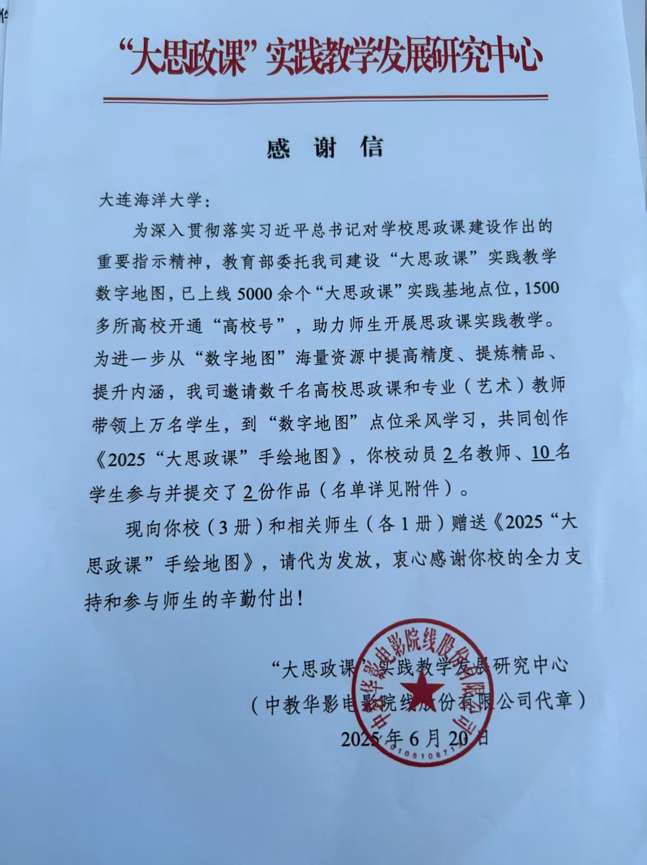 近日,“大思政课”实践教学发展研究中心致函公司,对马克思主义公司及公司师生在参与教育部委托建设的“大思政课”实践教学数字地图创作和《2025“大思政课”手绘地图》编撰工作中的突出贡献表示肯定。